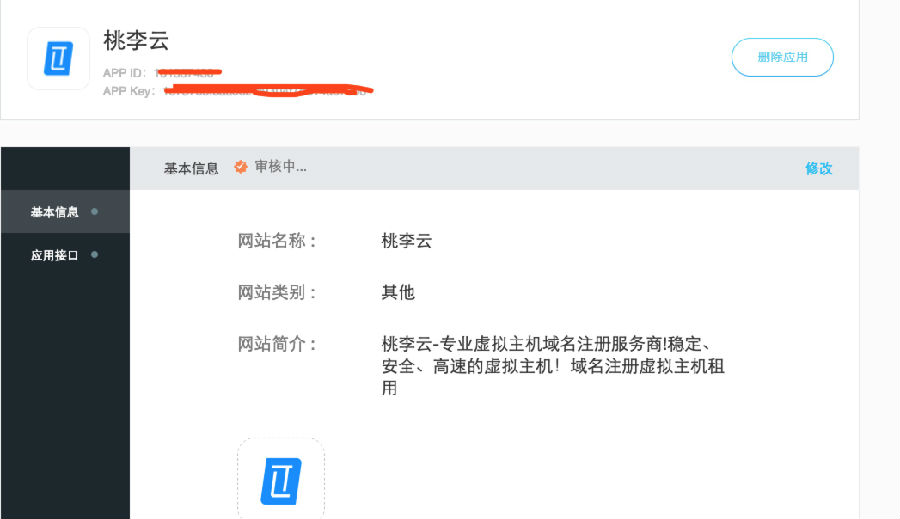 网站信息填写完成,点击“创建应用”后,网站应用创建完成,点击“应用管理”,进入管理中心,在管理中心可以查看到网站获取的appid和appkey,如下图所示: